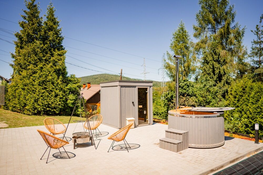 Na zagospodarowanej działce znajdziesz balię, miejsce na odpoczynek oraz mini-strefę SPA. Idealne tło do wieczorów pod gwiazdami.