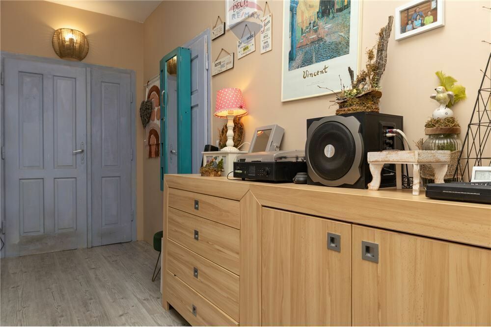 Na podłogach panele i płytki. Kuchnia wyposażona w pełny sprzęt
