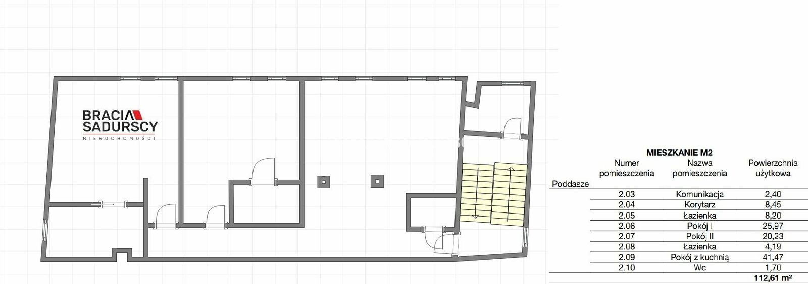 Samodzielny lokal mieszkalny nr M1 o powierzchni użytkowej 112 m², położony jest na drugiej kondygnacji (pierwszym