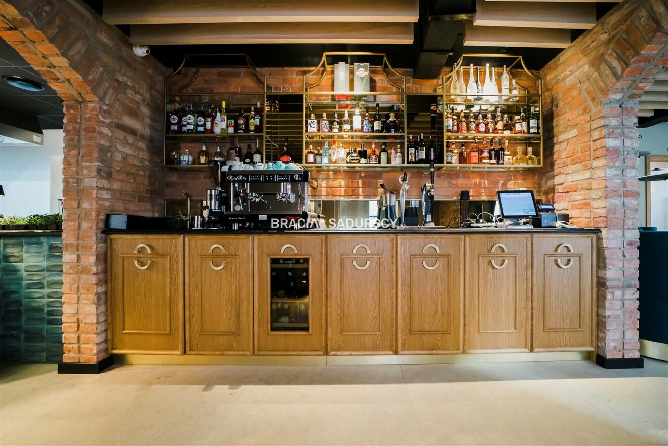 instalację do piwa oraz duży ekspres kolbowy do kawy. Nad komodą znajdują się stałe półki wiszące na