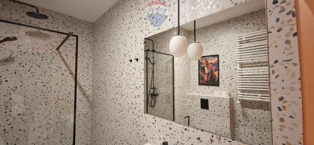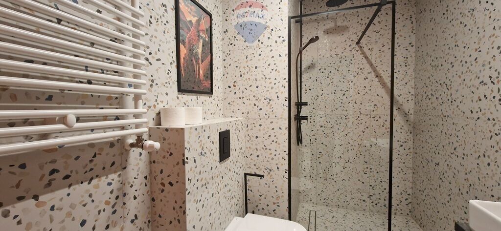 - Łazienka z prysznicem , umywalką .