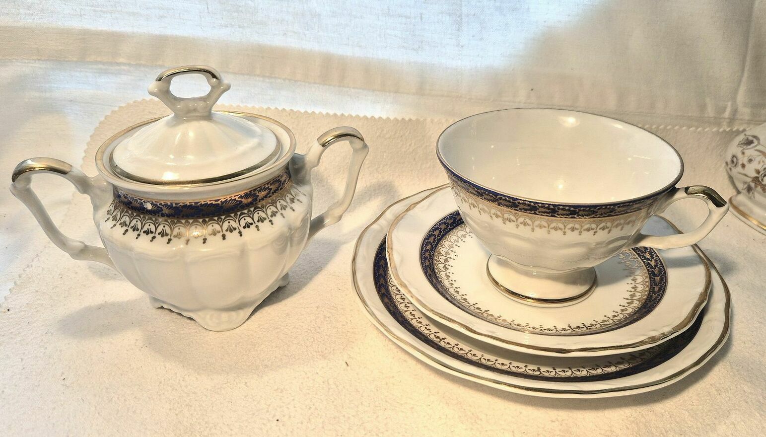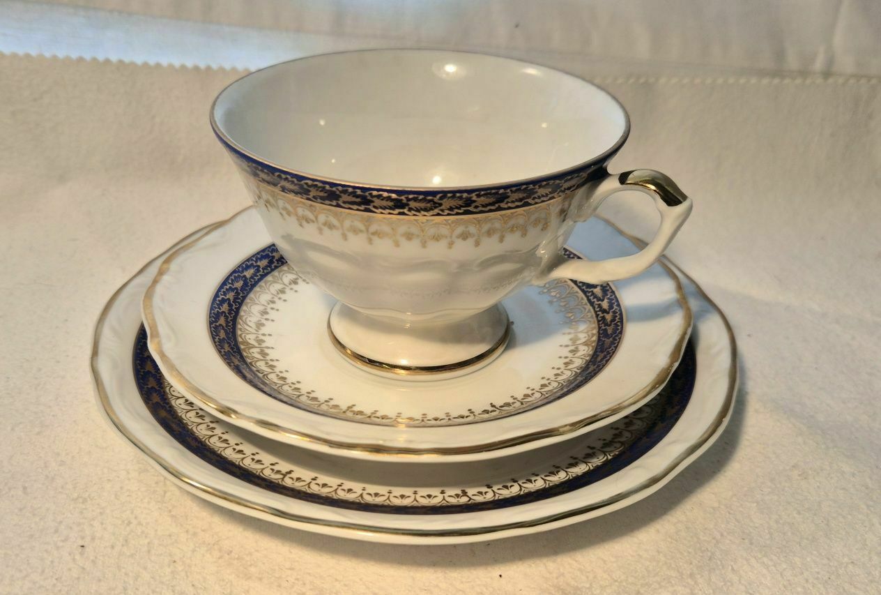 Sprzedam trio śniadaniowe. W komplecie z cukierniczką. Mogę rozdzielić i sprzedać osobno trio - filiżanka, spodek, talerzyk i osobno cukierniczka.Elegancka porcelana dobrej jakości.
