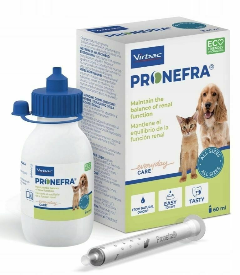Virbac Pronefra 60 ml jest zalecana dla kotów i psów w celu utrzymania zrównoważonej pracy nerek.Wspomaga psy i koty z przewlekłą niewydolnością nerek